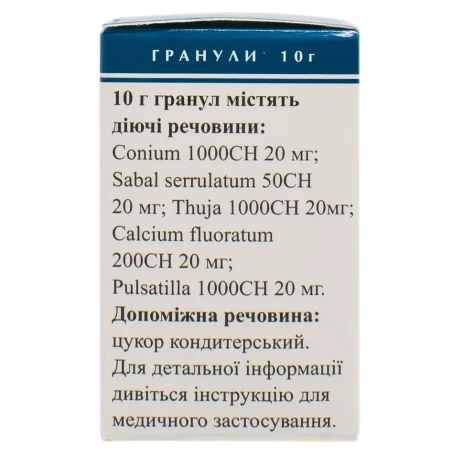 діючі речовини: 10 г гранул містять: Conium 1000CH 20 мг, Sabal serrulatum 50CH 20 мг, Thuja 1000CH 20 мг, Calcium fluoratum 200CH 20 мг, Pulsatilla 1000CH 20 мг;