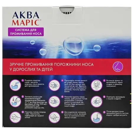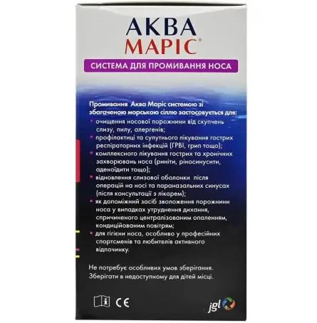 Устройство рекомендовано для индивидуального использования и применяется в целях профилактики гриппа, ОРВИ, лечения ринитов и синуситов, гигиены носа (лицам, работающим на вредном производстве, спортсменам) путем промывания полости носа и носоглотки специальным раствором. Устройство оториноларингологическое АКВА МАРИС позволяет удобно и безопасно промывать нос по всей длине носовых ходов. Жидкость для промывания подается в полость носа самотеком, то есть без дополнительного давления, что позволяет избегать такого осложнения как воспаление среднего уха (отит). Процедура проста и безопасна даже для детей, беременных и кормящих женщин.