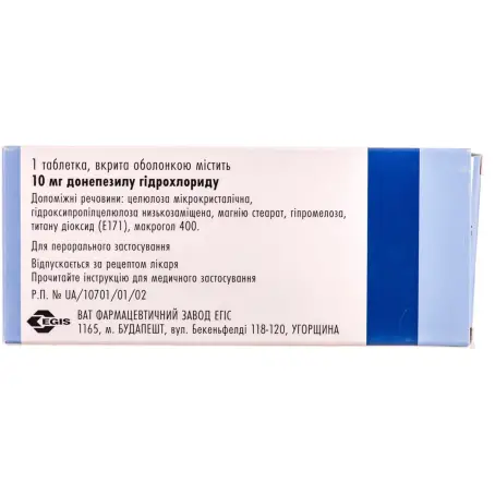 1 таблетка, покрытая оболочкой, содержит гидрохлорида донепезила 5 мг или 10 мг;