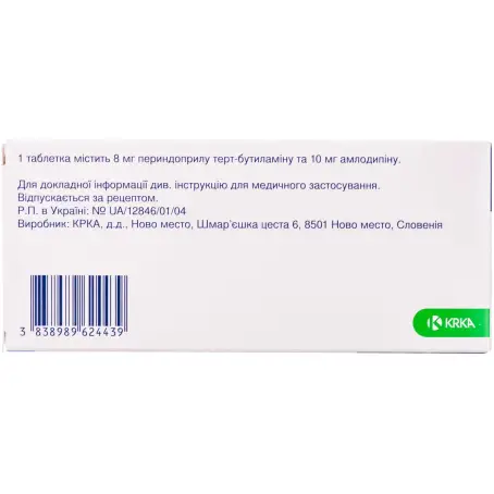 8 мг периндоприла терт-бутиламина (что соответствует 6,68 мг периндоприла) и 5 мг амлодипина (что соответствует 6,935 мг амлодипина бесилата), или 8 мг периндоприла