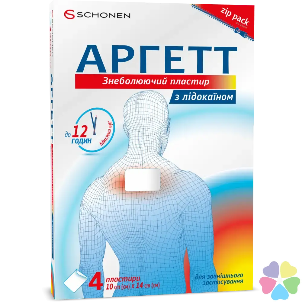 АРГЕТТ знеболючий пластир з Лідокаїном застосована технологія гідрогелевого нанесення ментолу та лідокаїну для максимальної дії та тимчасового полегшення болю в спині, шиї, кінцівках, м’язах та суглобах. Компоненти пластиру — ментол 1% та лідокаїн 4% вивільняються з гідрогелевої основи та проникають через шкіру і надають тимчасову болезаспокійливу дію при запаленнях суглобів, м’язів, зв’язок, сухожиль, викликаних травмою, при розтягненнях, вивихах, синцях, невралгіях (запаленнях нервових закінчень), міалгіях (запаленнях м’язів).