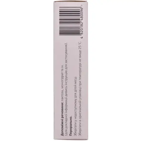 другие составляющие: целлюлоза микрокристаллическая (тип 101); лактоза, моногидрат; крахмал кукурузный; гидроксипропилцеллюлоза; целлюлоза микрокристаллическая (тип 102); стеарат магния.