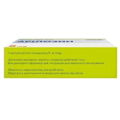Способ применения и дозыПрименять взрослым. Принимать внутрь. Рекомендованная дозировка составляет 8 мг 1 раз в сутки. Для отдельных групп пациентов рекомендуется 1 капсула силодозина 4 мг 1 раз в сутки (см. ниже).