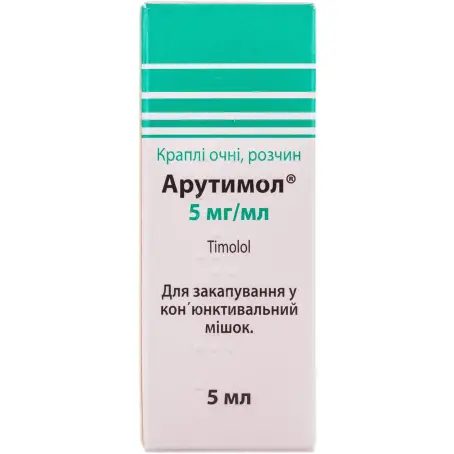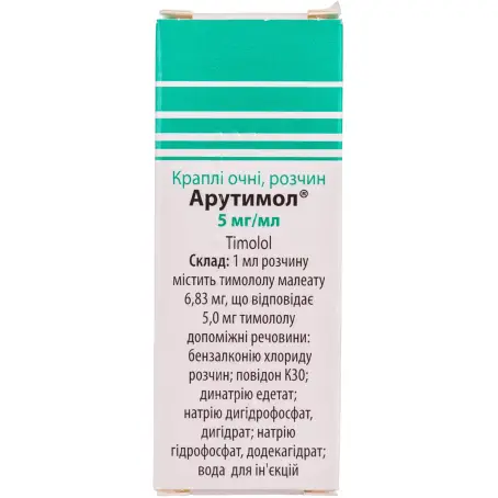 1 мл Арутимол , капли глазные, раствор 5 мг/мл: содержит тимолола малеата 6,83 мг, что соответствует 5 мг тимолола;