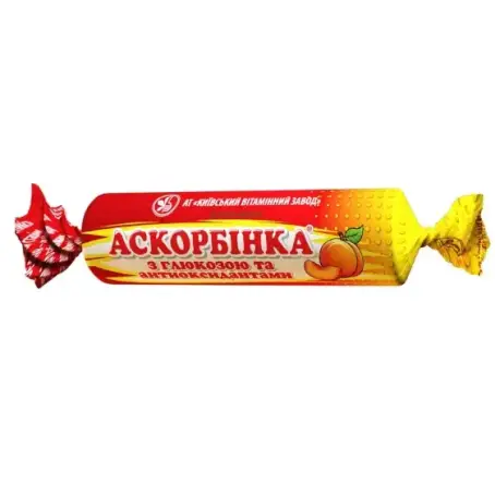 Глюкозы моногидрат - 2,3 г (g); кислота аскорбиновая - 6 мг (mg); витамин Е - 0,8 мг (mg); β-каротин - 420 мкг (µg); кислота лимонная безводная; кислота стеариновая; магния стеарат; ароматизатор пищевой персик; красители: железа оксид красный (Е172), железа оксид желтый (Е172).