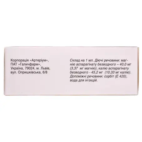 действующие вещества:1 мл раствора содержит магния аспарагината безводного - 40,0 мг (3,37 мг магния), калия аспарагината безводного - 45,2 мг (10,33 мг калия);
