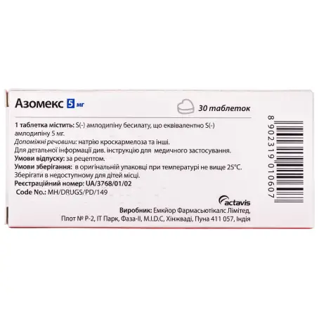 Поскольку действующее вещество лекарственного средства Азомекс (S(-) amlodipine besilate), в отличие от амлодипина (рацемической смеси), содержит только активную S(-) форму изомера, следует принять во внимание, что для лечения артериальной гипертензии легкой и умеренной степени тяжести таблетка Азомекса дозировкой 2,5 мг соответствует 5 мг амлодипина, а таблетка Азомекса дозировкой 5 мг - 10 мг амлодипина.
