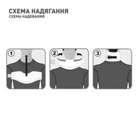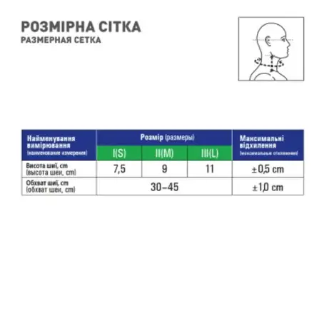 Размеры I, II и III — отвечают высоте шеи. Высота шеи — это вертикальный размер от угла нижней челюсти к ключице при равном положении головы. Длина бандажа регулируется за счет застежке-липучке и лежит в диапазоне от 30 до 45 см