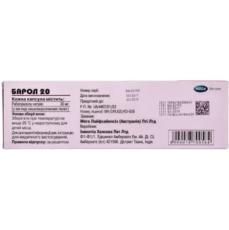 Рабепразол натрий приводит к сильному и длительному снижению продуцирования желудочной кислоты. Таким образом, рабепразол может взаимодействовать с препаратами, абсорбция которых зависит от показателя рН желудочного содержимого. Одновременное применение рабепразола натрия и кетоконазола или итраконазола может привести к снижению концентрации последних в плазме крови, а применение дигоксином может привести к повышению концентрации последнего. Таким образом, отдельным пациентам, применяющим указанные препараты вместе с Баролом, следует находиться под наблюдением врача для определения необходимости корректировки дозы.