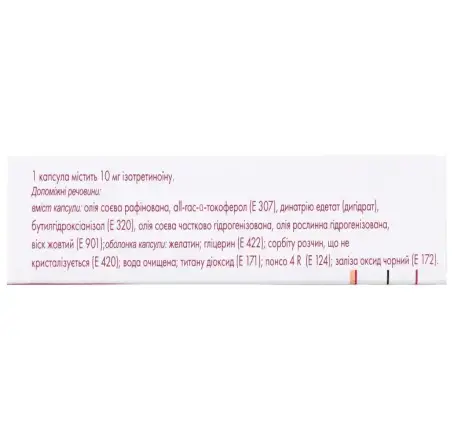 Составдействующее вещество: изотретиноин; 1 капсула содержит 10 мг или 20 мг изотретиноина;