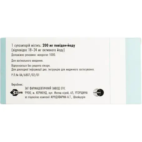 1 вагинальный суппозиторий содержит 200 мг повидон-йода (соответствует 18-24 мг активного йода);