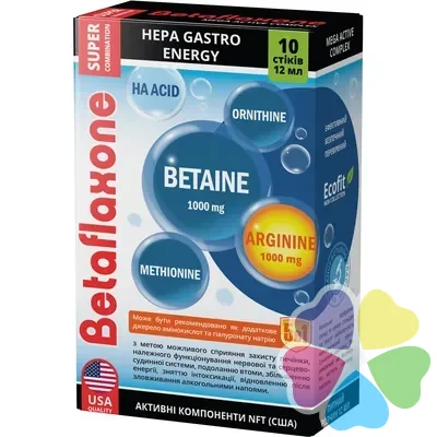 Состав (на 1 сток): Аргинин цитрат (arginine citrate) 1000 мг (mg), бетаин гидрохлорид (betaine hydrochloride) - 1000 мг (mg), метионин (methionine) - 300 мг (mg), орнитин гидрохлорид (mg), гиалуроновая кислота (hyaluronic acid) – 15 мг (mg).