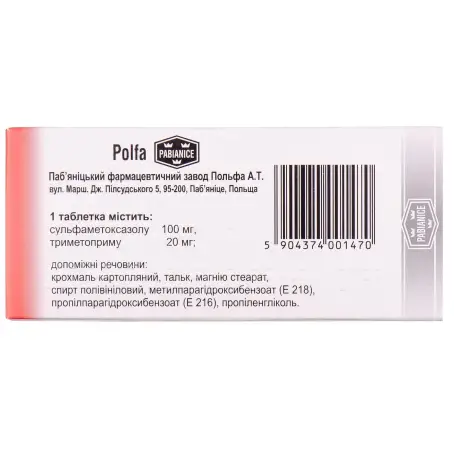 1 таблетка 100 мг/20 мг содержит сульфаметоксазол 100 мг, триметоприма 20 мг;