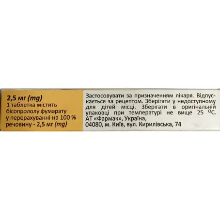 1 таблетка содержит бисопролола фумарата в пересчете на 100% вещество 2,5 мг;