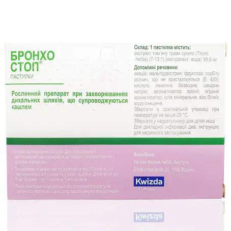 Фармакологические свойства.Фармакодинамика.«БРОНХОСТОП® ПАСТИЛКИ» применяется как отхаркивающее средство в случае кашля, связанного с простудой, преимущественно при длительной терапии. Эфирные масла и флавоноиды травы тимьяна (чабреца) оказывают бронхолитическое, секретолитическое и антибактериальное действие, таким образом способствуют быстрому разжижению мокроты, накопившейся в дыхательных путях, уменьшают кашель, облегчают дыхание, а также влияют на возбудителя инфекции.