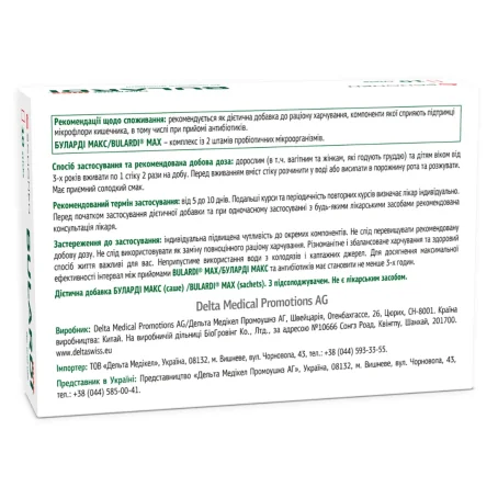 индивидуальная повышенная чувствительность к отдельным компонентам. Не следует превышать рекомендуемую суточную дозу. Не следует использовать в качестве замены полноценного рациона питания. Разнообразное и сбалансированное питание и здоровый образ жизни важны для вас. Недопустимо использование воды из колодцев и каптажных источников. Для достижения максимальной эффективности интервал между приемами BULARDI® MAX/БУЛАРДИ МАКС и антибиотиков должно составлять не менее 3 часов.