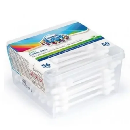 Ватяные палочки для ухода, в пластиковом боксе (56 шт). Антибактериальные. Специальная форма с ограничителем не позволяет вставлять их слишком глубоко в ухо или нос ребенка.