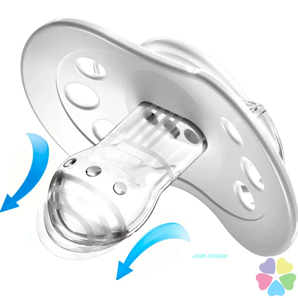 Симметрическая форма пустышки не нарушает естественное развитие зубов и десен, а уникальное строение даёт возможность ребенку свободно дышать через нос и глотать слюну.