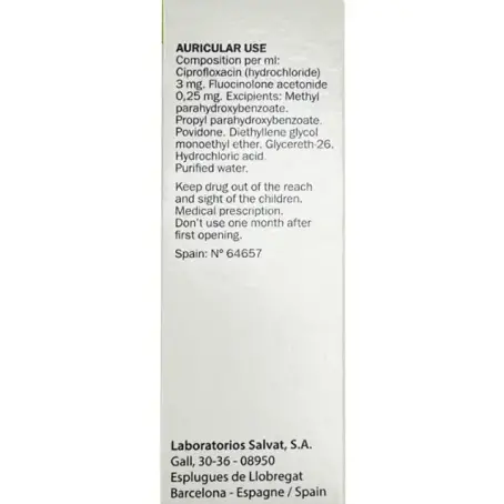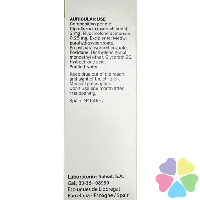 1 мл содержит ципрофлоксацина 3 мг (в виде ципрофлоксацина гидрохлорида моногидрата 3,49 мг), флуоцинолона ацетонида 0,25 мг;
