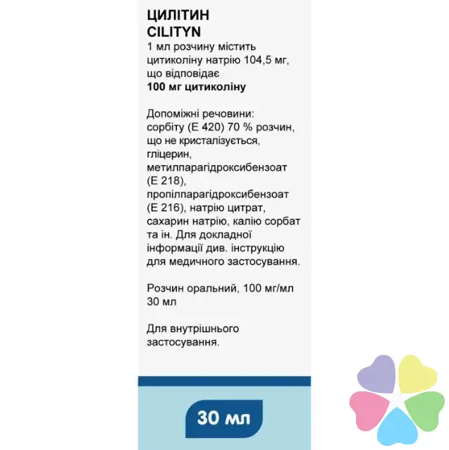 1 мл раствора содержит цитиколина натрия 104,5 мг, что соответствует 100 мг цитиколина;