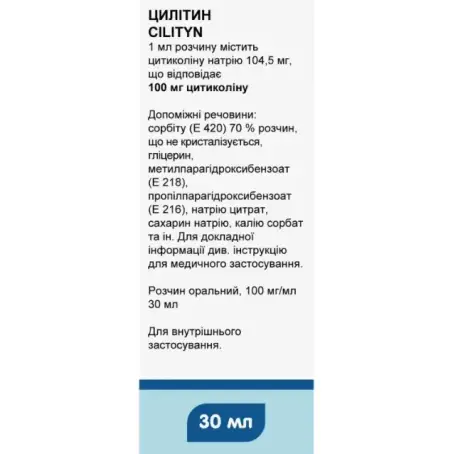 Пациентам с наследственными нарушениями толерантности к фруктозе не следует принимать Цитиколин, раствор для перорального применения, поскольку препарат содержит сорбит (Е 420). Метилпарагидроксибензоат и пропилпарагидроксибензоат, содержащиеся в составе препарата, могут вызвать аллергические реакции (обычно замедленного типа).