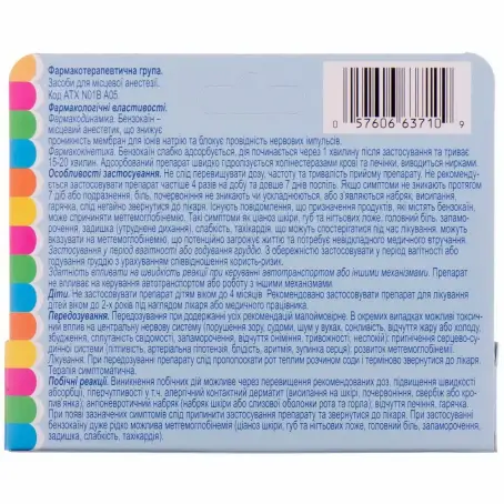Бензокаин - местный анестетик, снижающий проницаемость мембран для ионов натрия и блокирующий проводимость нервных импульсов.