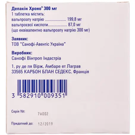 В фармакологических исследованиях на животных вальпроат ингибировал различные экспериментально индуцированные судороги (генерализованные и фокальные). Аналогично и у людей противоэпилептический эффект вальпроата также может наблюдаться при разных типах эпилепсии. Вальпроат, скорее всего, действует путем усиления ГАМК-эргической активности, ингибируя или сдерживая распространение электрического разряда. В некоторых исследованиях in vitro наблюдалось стимулирующее действие вальпроата на репликацию ВИЧ-1. Однако этот эффект не очень выражен и не воспроизводим во всех экспериментах. Клинические последствия этого наблюдения у ВИЧ-1-инфицированных пациентов неизвестны. Эти данные следует учитывать при оценке измерений вирусной нагрузки при применении вальпроата натрия ВИЧ-1-инфицированным пациентам. Фармакокинетика. Всасывание. Биодоступность вальпроата в плазме крови после перорального приема составляет около 100%. Препарат Депакин Хроно 300 мг присутствует в плазме крови в виде вальпроевой кислоты. Препарат Депакин Хроно 300 мг немедленно всасывается в желудочно-кишечном тракте. Его абсорбция является постоянной и продолжительной. Поэтому нет пиков концентрации препарата в плазме крови, а терапевтические концентрации вальпроевой кислоты лучше поддерживаются со временем. Деление. Объем распределения вальпроевой кислоты преимущественно ограничен кровью и внеклеточной жидкостью, испытывающей быстрый обмен. Вальпроевая кислота предпочтительно связывается с альбумином плазмы крови. Связывание с белками является дозозависимым и насыщаемым. При общих уровнях препарата в плазме крови 40-100 мг/л, как правило, 6-15% вальпроевой кислоты не связаны. Уровень вальпроевой кислоты в спинномозговой жидкости приближен к концентрации несвязанного вещества в плазме крови (около 10%)