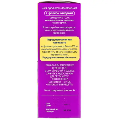5 мл готовой суспензии содержит мебгидролина (диазолина) 0,03 г (30,0 мг);