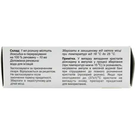 1 мл раствора содержит диоксидина 10 мг в пересчете на 100% вещество;