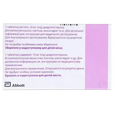 діюча речовина: 1 таблетка містить дидрогестерону 10 мг;