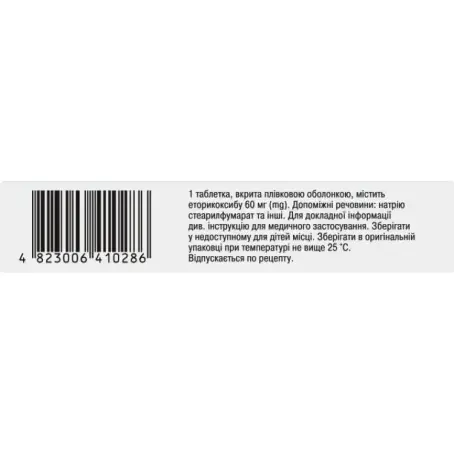 1 таблетка, покрытая пленочной оболочкой, содержит эторикоксиб 60 мг, 90 мг или 120 мг;