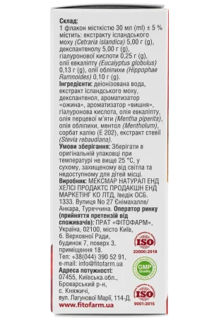 1 флакон емкостью 30 мл (ml) ± 5% содержит: экстракта исландского мха (Cetraria islandica) 5,00 г (g), декспантенола 5,00 г (g), гиалуроновой кислоты 0,25 г (g), масла эвкалипта (Eucalyptus globulus) 0,13 г 0,10 г (g).