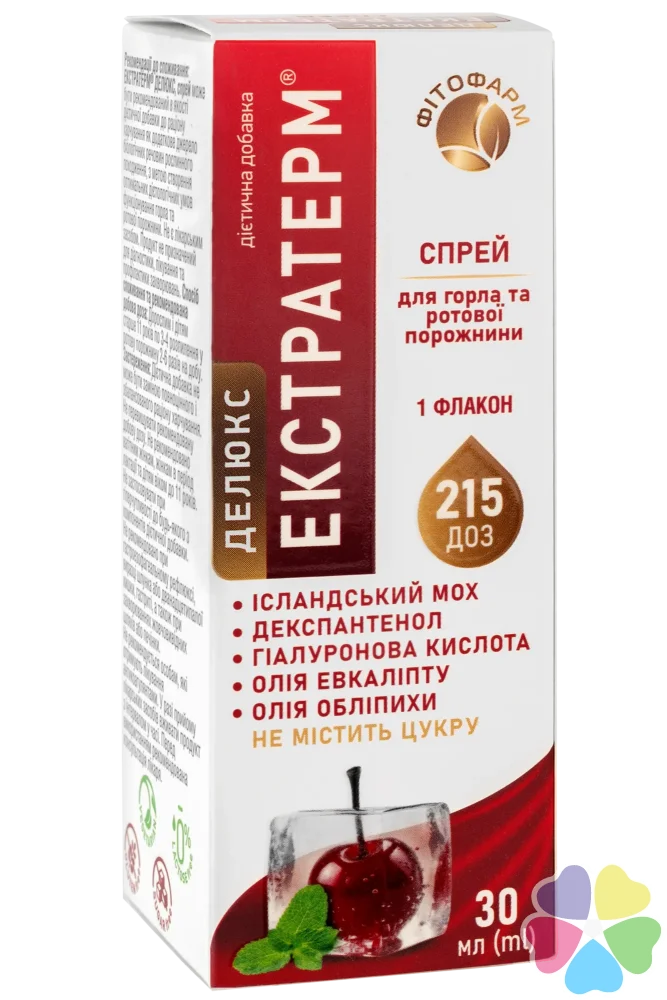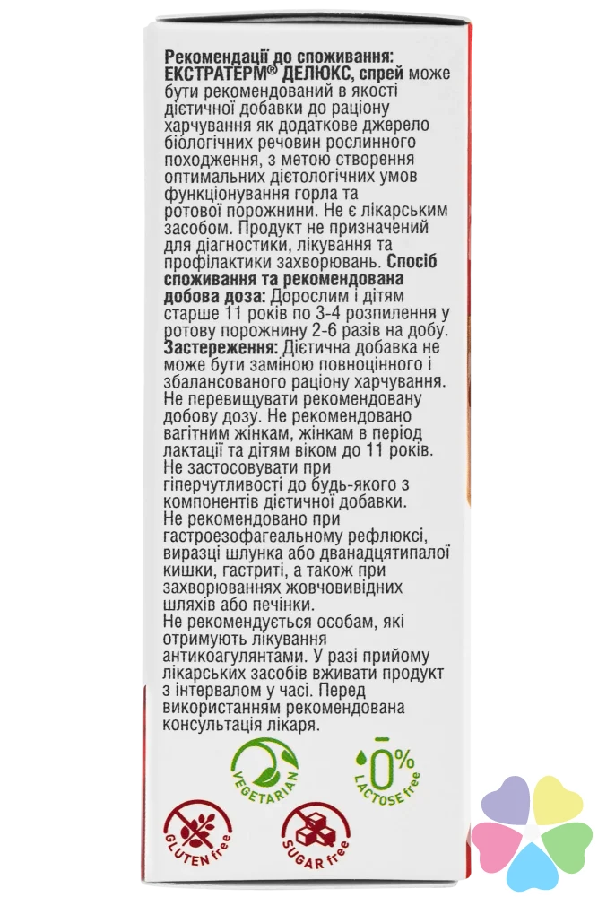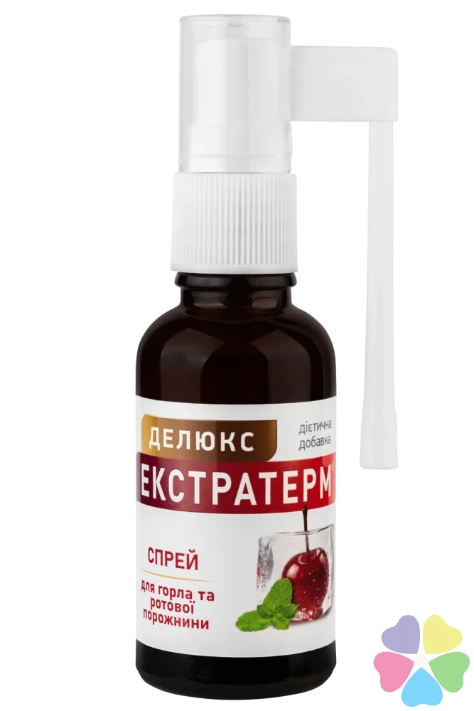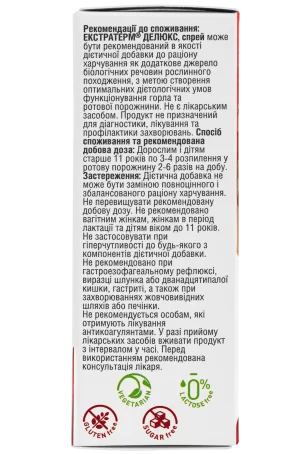 ЭКСТРАТЕРМ® Делюкс, спрей может быть рекомендован в качестве диетической добавки к рациону питания как дополнительный источник биологических веществ растительного происхождения с целью создания оптимальных диетологических условий функционирования горла и полости рта.
