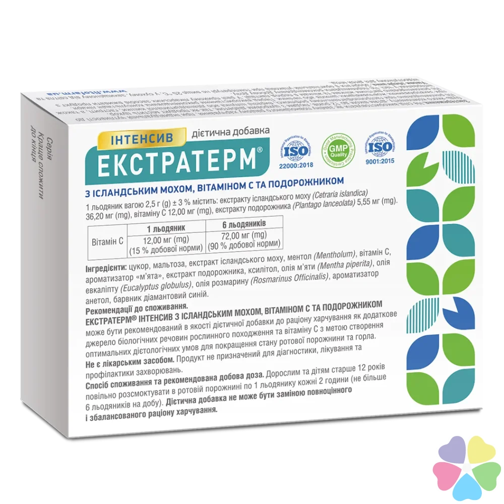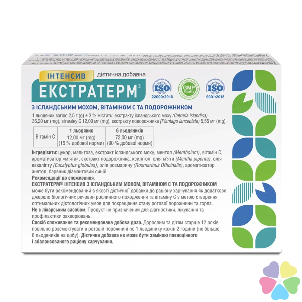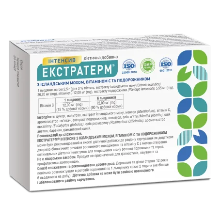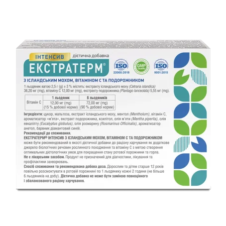 ЭКСТРАТЕРМ® ИНТЕНСИВ С ИСЛАНДСКИМ МОХОМ, ВИТАМИНОМ С И ПУТЕШЕСТВЕННИКОМ может быть рекомендован в качестве диетической добавки к рациону питания как дополнительный источник биологических веществ растительного происхождения и витамина С с целью создания оптимальных диетологических условий для улучшения состояния полости рта и горла.