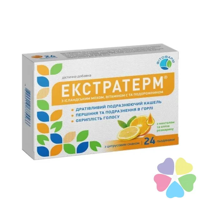 Экстратерм с исландским мхом, витамином С и подорожником леденцы с цитрусовым вкусом №24 можно купить в наших аптеках сейчас здесь: Фанерная, Златоустовская 50, Мокрая 20, Дримтаун 2, Комфортаун, Григоренко 5А, 6 больница, Жемчужина Кадетского, Комфорт Таун, Амеда, Парк Феофания, Исида, ЖК Заречный, Драгоманова, Александровская Больница, Балукова, ЖК Яскравий, Дипломат-Хол, Французский квартал, Окружная, метро Университет, The Lakes, Карат, Дарница, Сфера, Феофания, Франка, Чабани, Печерский, Лабораторная, , Львів, Берковецкая, Вышгород, Иоанна Павла