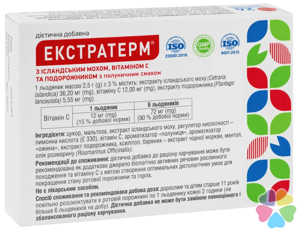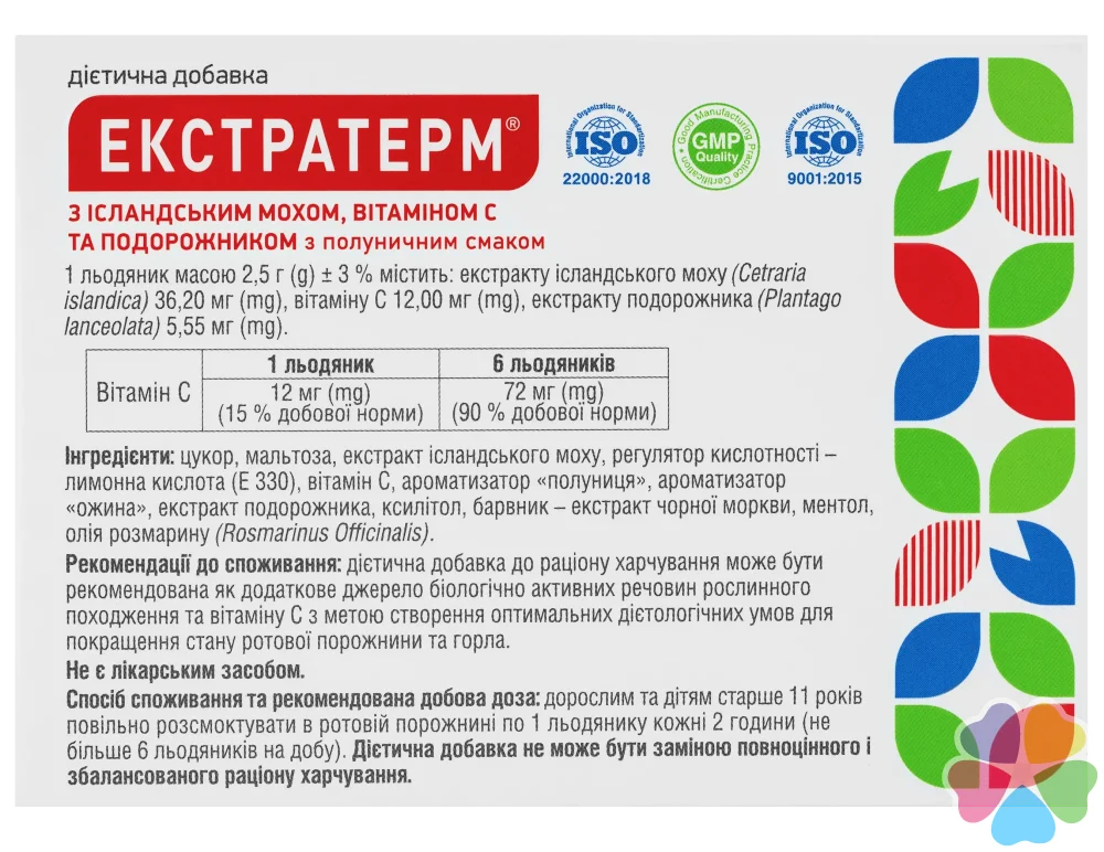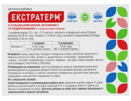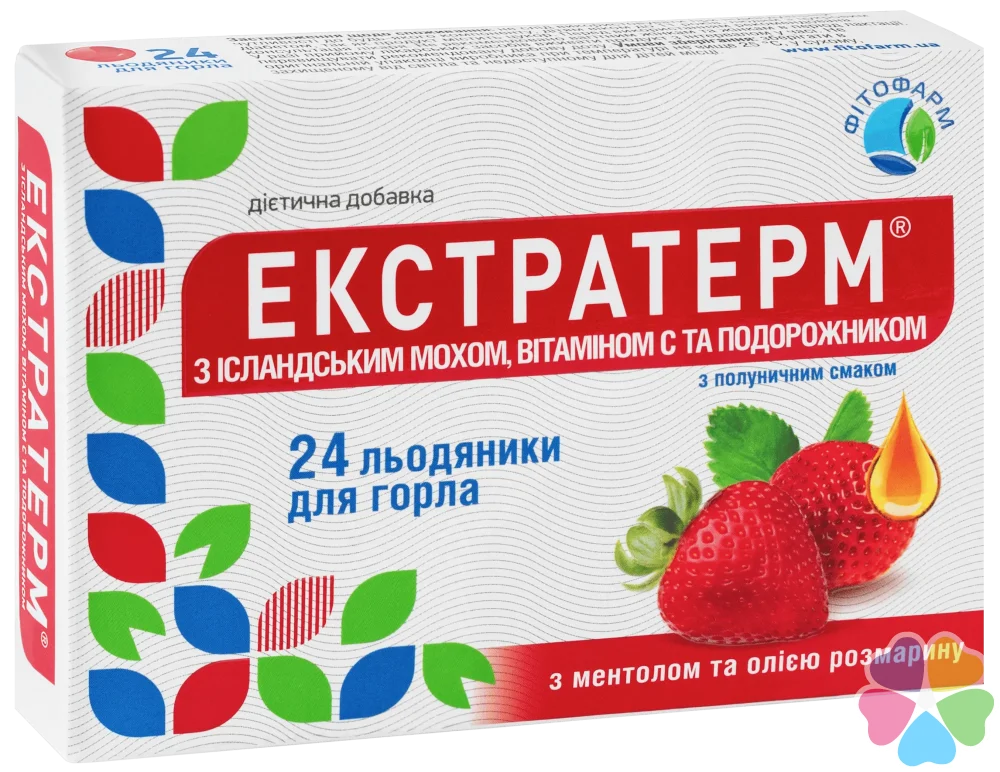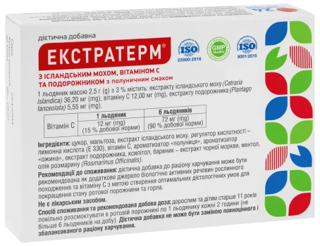 Экстратерм с исландским мхом, витамином С и подорожником леденцы (с клубничным вкусом), №24 можно купить в наших аптеках сейчас здесь: Свободы, Павловская, Комфортаун, Рудницкого, Святослава Храброго 7, 5 роддом, 6 больница, Софиевская Борщаговка, Минская, Евромісто, Вистамед, Старонаводницкая, Оболонь, метро Осокорки, Драгомирова, Больница №12, ЖК Яскравий, Окружная, Боярская 4Б, Respublika-2, Университетская, Уютный, Соборная, Львов, Богдановская, Липки, Замарстыновская, Шевченко Львов, Франко, Вышгород, Епіцентр