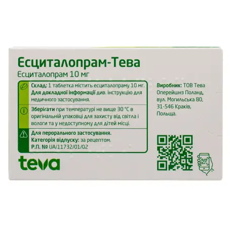Эсциталопрам-Тева, 10 мг: белые, круглые, двояковыпуклые, покрытые пленочной оболочкой таблетки с тиснением «10» с одной стороны таблетки и линией разлома с другой стороны таблетки. Трещины или сколы не наблюдаются.