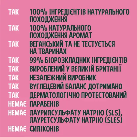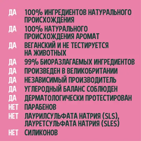 - Не содержит силиконов, парабенов, лаурилсульфата натрия (SLS) и лауретсульфата натрия (SLES)