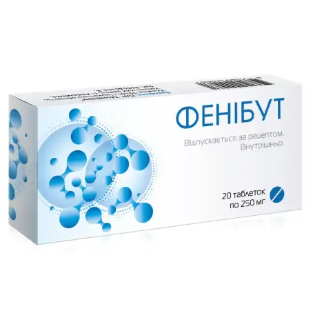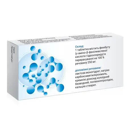 1 таблетка містить фенібуту (γ-аміно-β-фенілмасляної кислоти гідрохлориду) в перерахуванні на 100 % речовину 250 мг;