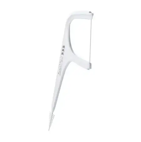 Эластичная зубочистка с улучшенным фторидным покрытием глубоко проникает в пространство между зубами.