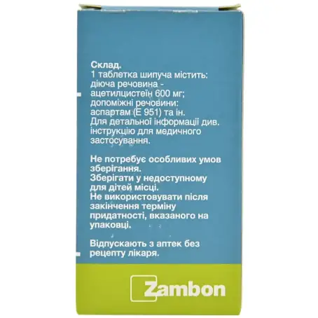 1 таблетка шипучая содержит ацетилцистеина 600 мг;