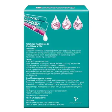 Составдействующие вещества: 10 мл суспензии содержат 500 мг альгината натрия, 213 мг гидрокарбоната натрия, 325 мг кальция карбоната;