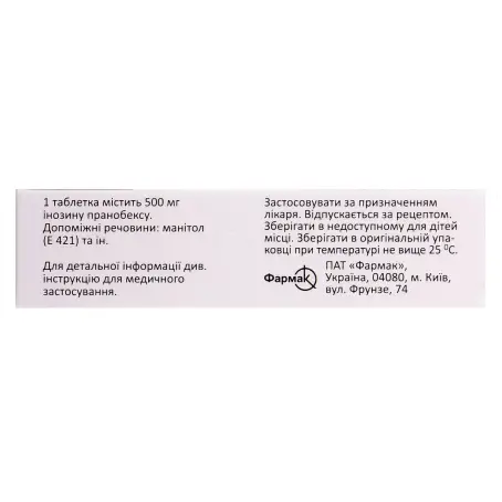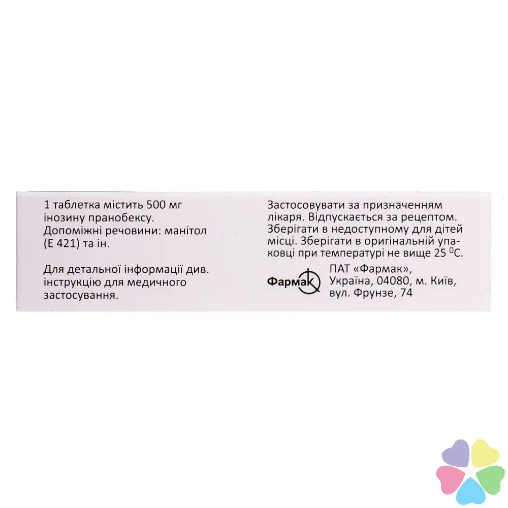 После приема внутрь в дозе 1,5 г максимальная концентрация инозина пранобекса в плазме крови достигается через 1 ч и составляет 600 мкг/мл. В организме инозин пранобекс метаболизируется в печени с образованием мочевой кислоты. Период полувыведения 4-(ацетиламино)бензоата составляет 50 мин, 1-(диметиламино)-2-пропанола - 3,5 часа. Выводится почками в виде метаболитов.