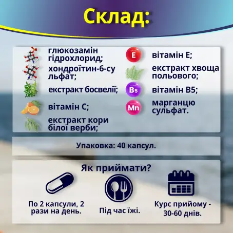 СоставГлюкозамин гидрохлорид-300 мг, Хондроитин-6-сульфат-300 мг, Экстракт босвелии- 47 мг, Витамин С-50 мг, Экстракт коры белой ивы-31 мг, Витамин Е-30 мг, Экстракт хвоща полевого-30 мг, Витамин В5 -8 мг Марганца сульфат-4 мг.