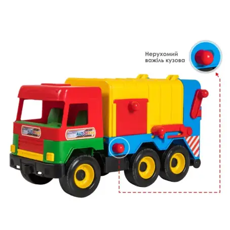 Внимание! Рычаг кузова неподвижный. Отверстие заблокировано производителем в связи с обновленными директивами безопасности игрушки ЕС в соответствии с требованиями сертификации возрастной категории товара 1+.ОписаниеМусоровоз имеет много подвижных элементов - систему очистки мусорного контейнера, подвижную крышку в боковом отсеке кузова, съемный мусорный бак.