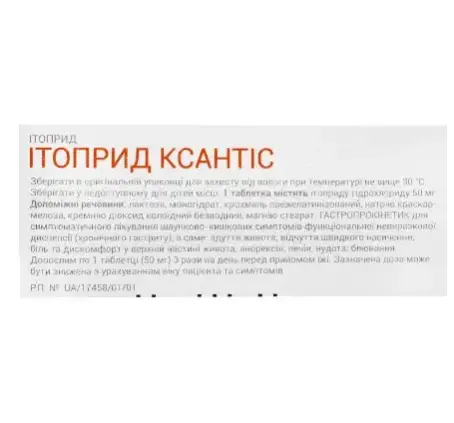 1 таблетка содержит 50 мг гидрохлорида итоприда;