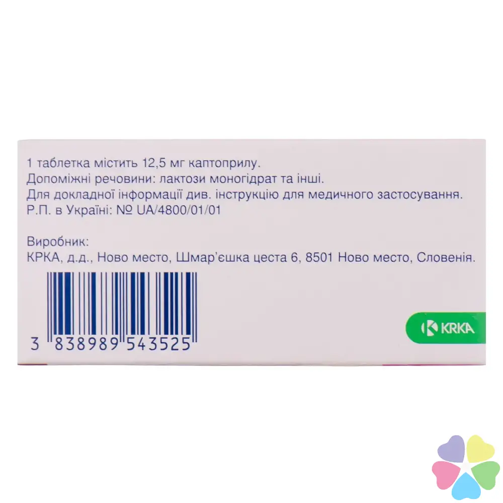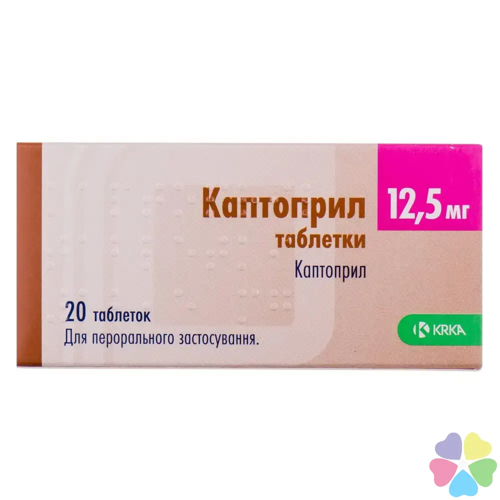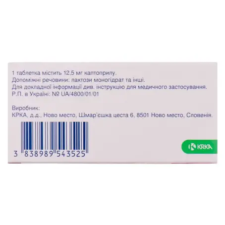 1 таблетка содержит 12,5 мг или 25 мг или 50 мг каптоприла;