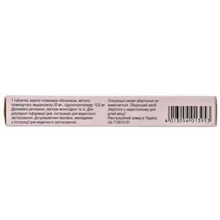 1 таблетка, покрытая пленочной оболочкой, содержит олмесартана медоксомила 20 мг и гидрохлоротиазида 12,5 мг или олмесартана медоксомила 20 мг и гидрохлоротиазида 25 мг;