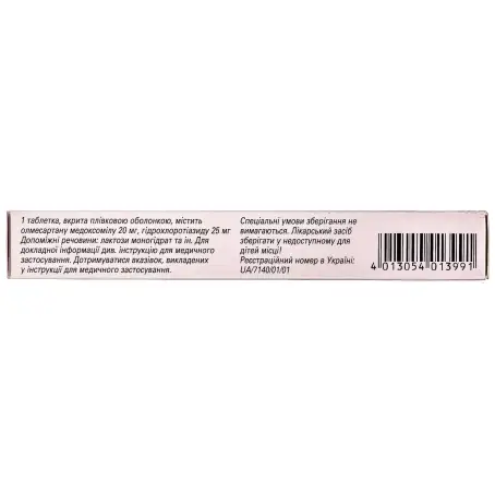 При применении гидрохлоротиазида в дозах 12,5 мг и 25 мг у пациентов, у которых эффективность монотерапии олмесартана медоксомилом в дозе 20 мг была недостаточной, наблюдалось дополнительное снижение среднесуточного систолического/диастолического артериального давления, которое измеряется путем амбулаторного/амбулаторного давления. мм рт.ст и 12/7 мм рт.ст по сравнению с начальными значениями, достигнутыми в результате монотерапии олмесартана медоксомилом). При измерении АД традиционным методом дополнительное снижение среднего систолического/диастолического АД в конце интервала дозирования составляло в соответствии с 11/10 мм рт.ст. и 16/11 мм рт.ст. (по сравнению с начальными значениями).