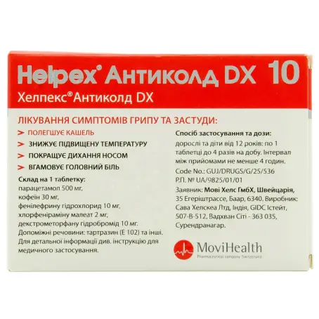 Симптоматическое лечение острых респираторных вирусных инфекций, гриппа (устранение сухого навязчивого кашля, снижение повышенной температуры тела, уменьшение насморка, снятие отека слизистой носа, устранение ломоты в теле, устранение головной боли).